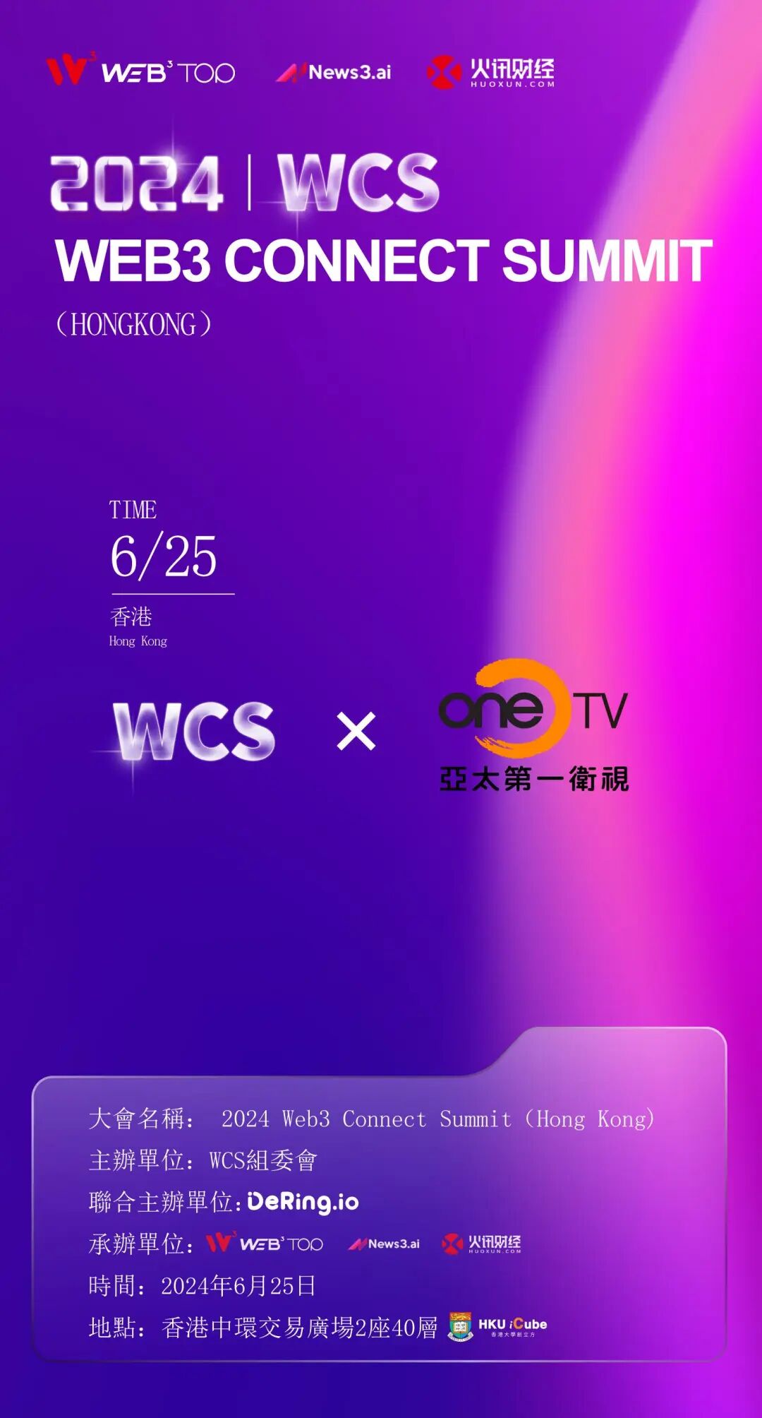 WCS香港峰会由WCS组委会主办,并由Web3TOP、News3.ai、火讯财经等顶尖机构联合承办。大会的核心议题聚焦于“深度链接,品牌破圈”,致力于集结全球Web3领域的翘楚,共同研讨Web3与实体经济的创新融合,以及香港在虚拟资产政策与商业发展上开创的崭新机遇。与此次峰会的紧密合作,对One TV而言,不仅意味着更多与业界精英交流学习的宝贵机会,更是推动集团在Web3领域持续发展的强大动力。
